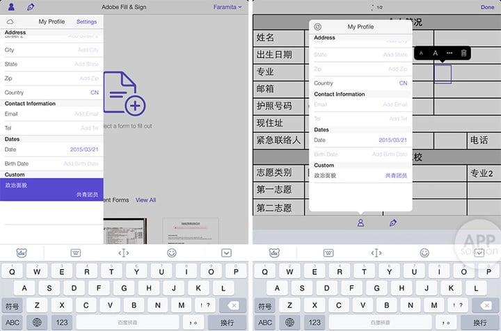 应用的另一技能则是大量处理表格的人的福音:预设信息填充。点击主界面左上角的人形按钮可以设置自己的信息。登陆了 Adobe ID 的话,还会自动同步储存的信息。