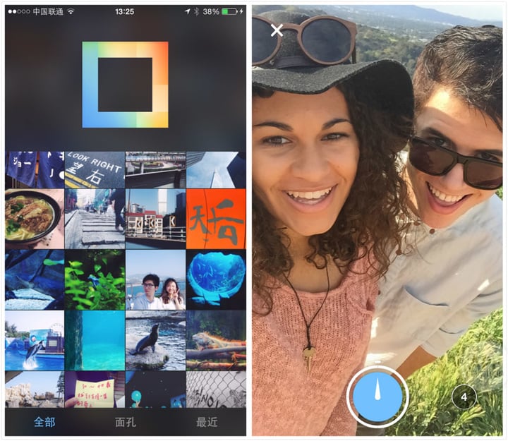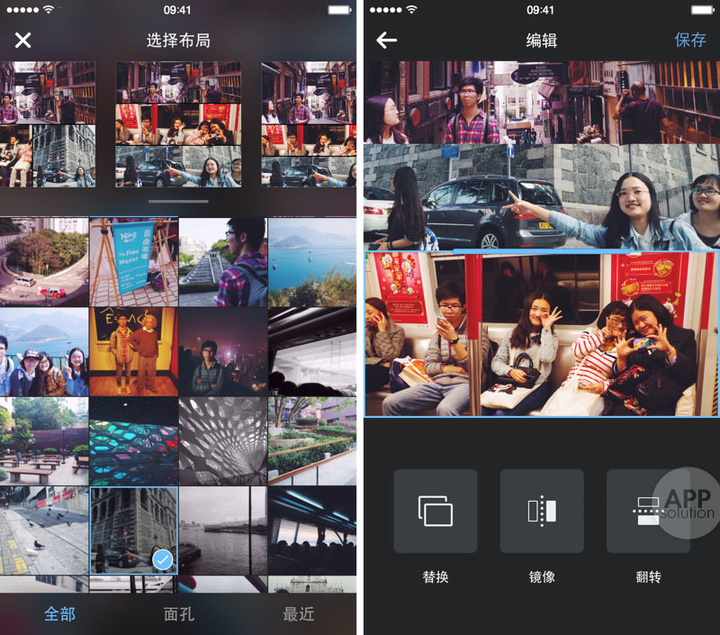 在拼贴照片时,想要快速找到添加的照片是一个不小的问题,Layout 给出了一个不错的解决方案。将手机图库里的照片分为「全部」、「面孔」以及「最近」,配上简洁优雅的 UI,让这开始的第一步变得轻松。