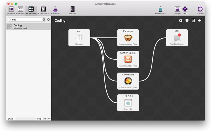 以下方这个「Cod」操作为例。通过它能够帮助快速进入开发模式,激活后输入关键词「cod」,Alfred 将帮我把 Xampp、Espresso、LiveReload、调试页面全部激活,打开本地开发环境来折腾下我的网站。执行完成后给我返回一个通知,告诉我所有事件执行完成。