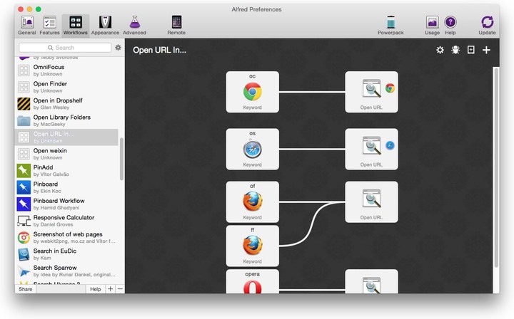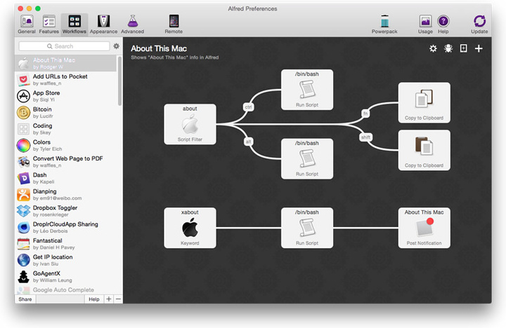 相对于 Workflows,前面提到的自定义搜索只是小儿科了。Alfred 允许用户通过脚本语言来控制 OS X 及其平台上的各类第三方应用。V2 推出的时候,好多程序员朋友们都异常激动。而对于像我们这样的普通用户来说,你就当它是一个超级插件中心吧。