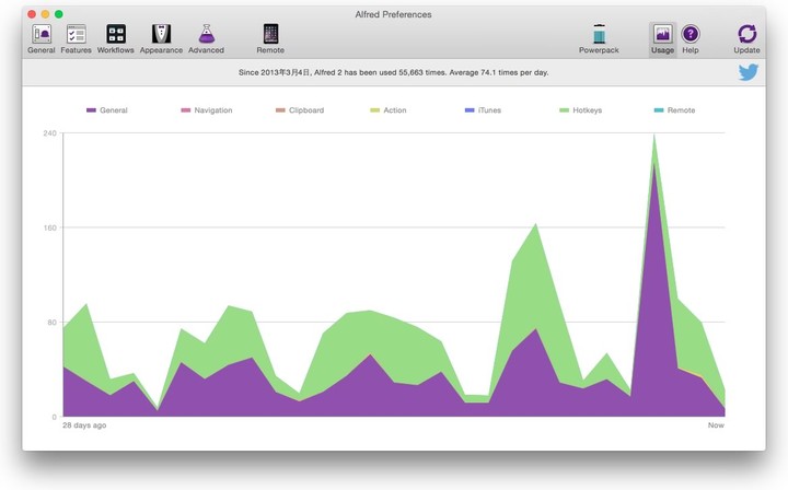 下面是我使用 Alfred 的一些数据:从 2.0 发布到现在我已经使用了 5w 多次,平均一天 74 次。其实正常的工作日基本都是快 200 次的样子了,可见现在我是多么地依赖它。