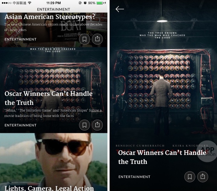 即便 Timeline 是款以内容为主的应用,它的外观和体验也毫不马虎。每当读者点开一个故事,应用直接全屏展现题图,这种沉浸式体验十分舒服。