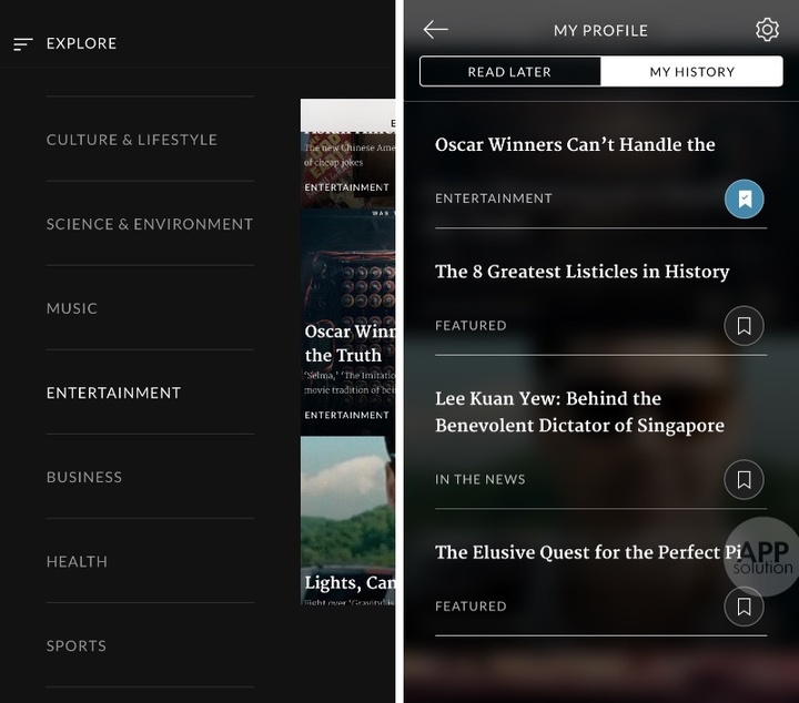 向右滑动主界面,可以选择感兴趣的栏目,而其中的每个故事,都是经过 Timeline 精心编排的。右侧边栏中,则能在登陆后查看阅读历史和保存的文章。总体来讲,Timeline 没有太多花哨的功能。