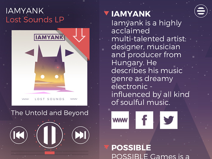 音乐是这款游戏的一大特点,每一关都搭配上一首优美的曲子,并且这 12 首曲子也将收录在制作人 Iamyank 的最新音乐专辑《Lost Sounds》中,同时在购买了这款游戏后能在官方网站下载该专辑。在游戏过程中,搭配上耳机感受更佳的音乐体验。