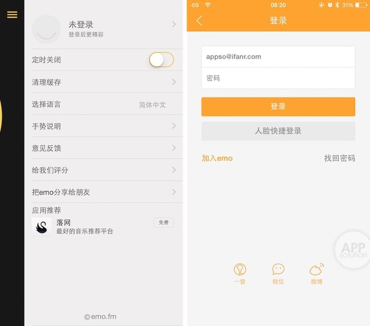 不登录并不影响 emo 的听歌体验,登录可以让它记录你的口味。有趣的是,emo 还提供了「人脸快捷登录」的选项。