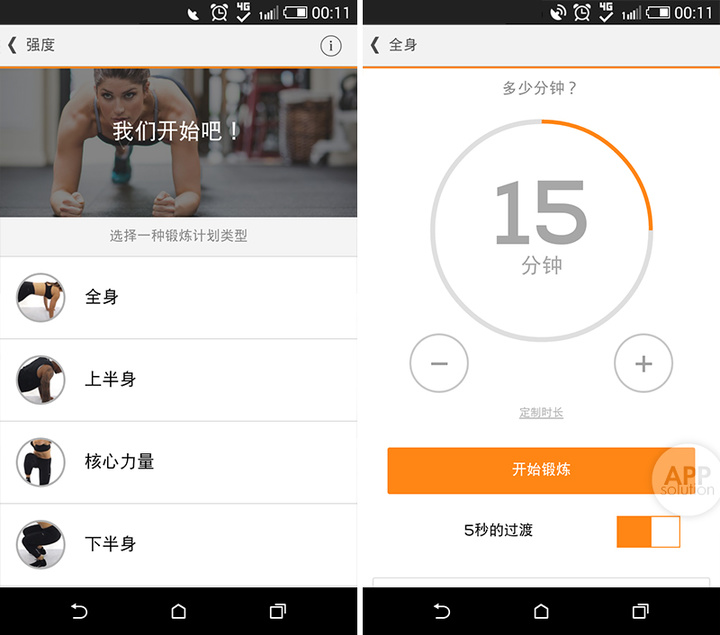 值得一提的是每一项锻炼开始前,Sworkit 将请求你设置锻炼时长以及锻炼内容的过渡休息时间,这将使得我们的身体更能适应锻炼内容。