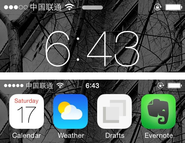 iOS 7 锁屏界面信号栏的图标和字体要稍大于主屏信号栏的图标和字体。