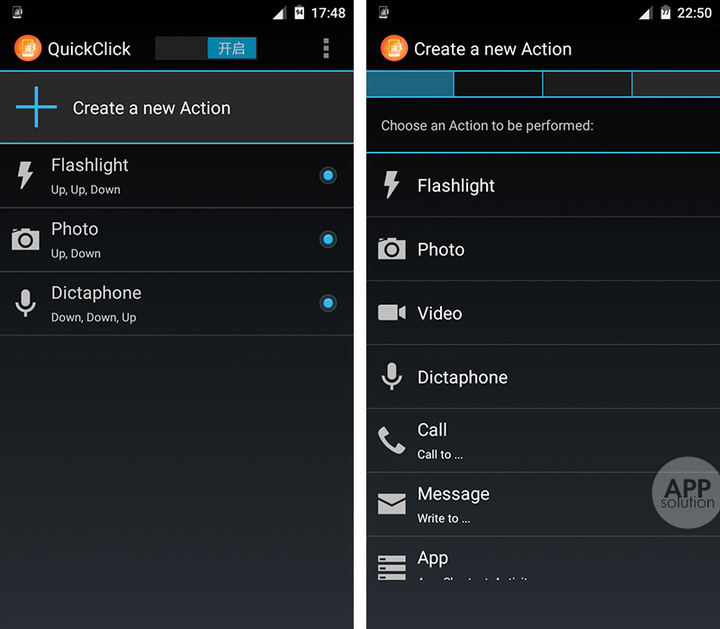 使用 QuickClick,用户可以通过对音量键的组合操作,来触发一系列动作,比如拍照、录音、启动 app。操作也很简单,打开 app,点击上方的添加按钮,便可以选择你需要触发的动作。