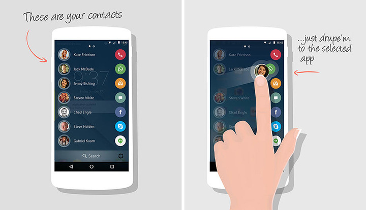 drupe 做的是,把你的联系方式,通信应用并在一起,你需要关心的是与 Ta 联系而不是在众多社交方式中切换。只需轻扫接触到合适的应用程序,接通交流。当然你需要配对好你的联系人的各种社交。