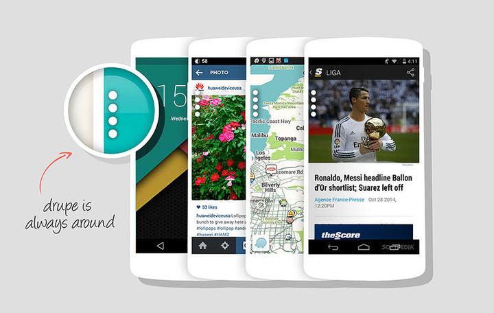 drupe 激活后会躺在你的屏幕边缘,无论你在任何界面中,通过划出这个小小的触发图标,就能方便发出联系的动作。
