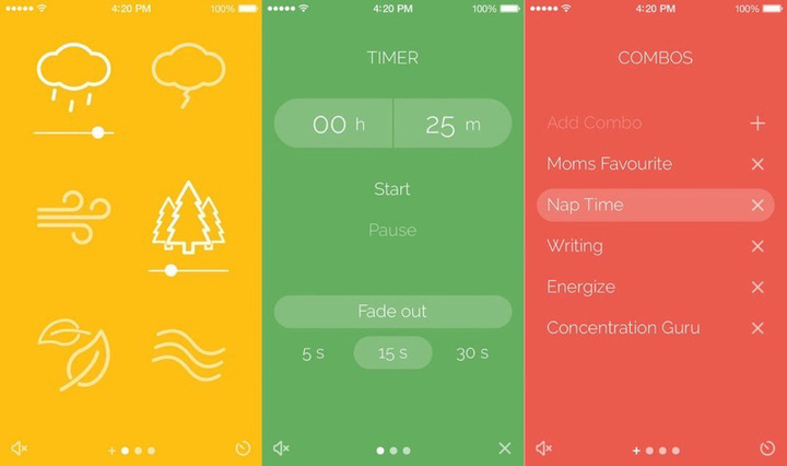 Noisli 是众多白噪音应用中声音库较多、设计也简单好用的一款。还可以同时播放两种以上的声音,并根据喜好调节音量比例,搭配自己喜爱的版本。