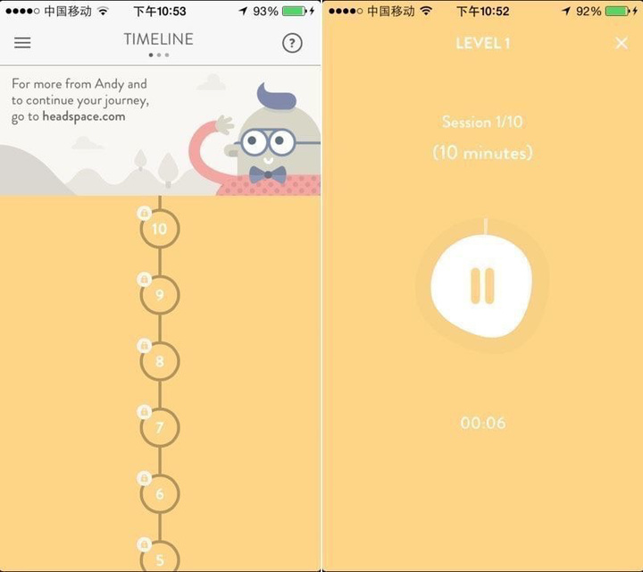 HeadSpace 是一个入门级的冥想应用,用语音引导你调整呼吸节奏,舒缓白天引起的的焦虑情绪。市面上的同类应用纵然不少,但 HeadSpace 因为清新萌系的画风,还有导师 Andy 低沉语音引导而让人特别有轻松愉悦的感觉。