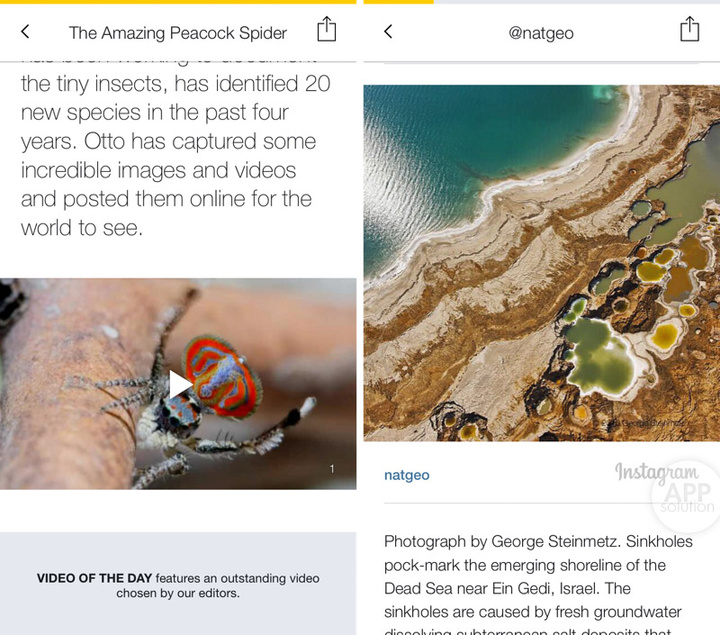 Nat Geo View 在电子杂志上的突破在于多种形态的结合,图片、文字与视频,在这里没有任何冲突,这是我颇为欣赏的一点。高质量的编排与设计,也让阅读成为了一件值得享受的事情,顶部的黄色线条会显示阅读进度,就像 National Geographic 那标志性的黄色线框,引人注目,广为流传。