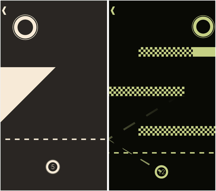 小球上的数字表示最多可以碰撞的次数,玩家需要利用一次或多次反弹让小球离手最终进入目标黑洞。游戏的全部操作只有两个 —— 按住小球用不同的力量和方向甩出小球,小球就会以不同的速度和方向自屏幕底端的虚线以下出发,以及碰撞次数用尽后双击屏幕任意位置即可重新开始。