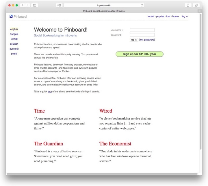 很多人第一眼看到它就会关掉。是的,Pinboard 的页面几乎没有设计,但它却做了让我觉得挺了不起的事情。