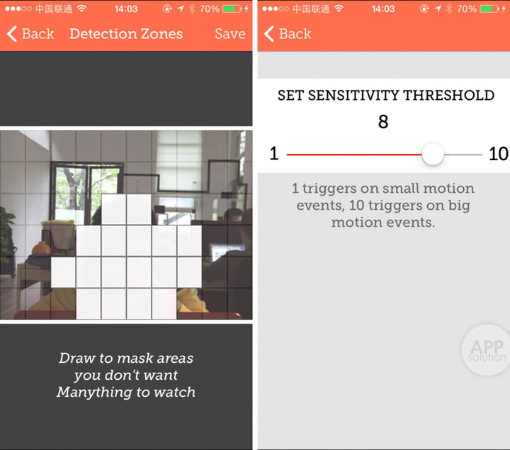在设置里的「Motion Detection」中,你可以设置触发底线和触发范围,而添加白色区域可以让 Manything 屏蔽此区域活动监控。