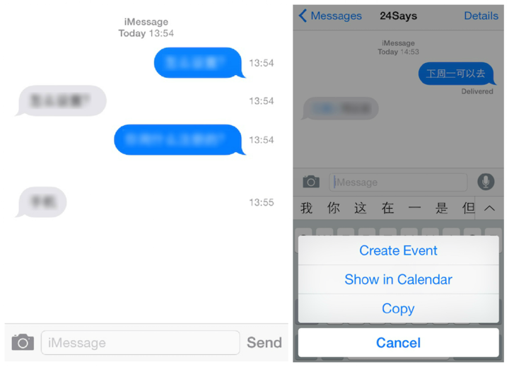 同上, iOS Human Interface Guidelines 中提到的 Modal Contexts「模态情境」,即为用户提供一种不脱离主任务的方式去完成另一个任务或取得信息的设计,在「信息」列表中也有所体现。当「信息」内容中出现类似时间的文字时,iOS 会对其进行下划线标注,直接点击即可快速创建日历或提醒事项。