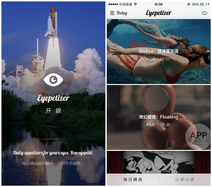 「开眼」设计极简,交互友好。启动页非常漂亮,一张渐渐放大的火箭升空,让人沉静下来。在「每日精选」里,每天精选 5 个视频,每个 3 – 5 分钟,画质高清,内容精彩。
