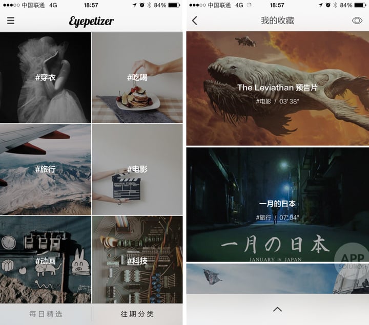 此外,除了「每日精选」,「往期分类」中涵盖了主流的不少类别,足够让你领悟视界的新发现和感受视觉创意的魅力。如此多有趣的视频,怎能不收藏下来,「开眼」当然也提供了这样的功能。