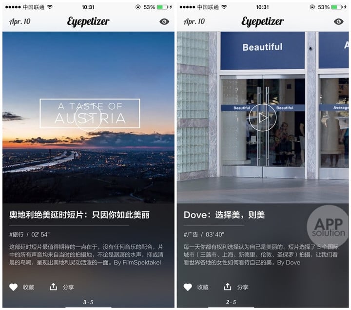这个 app 精选的视频内容覆盖了衣食住行的几乎所有话题,能够带给您一个完全不同的视野。配以简短的文字介绍,让你不仅能欣赏,还能快速地明白视频传达的信息。