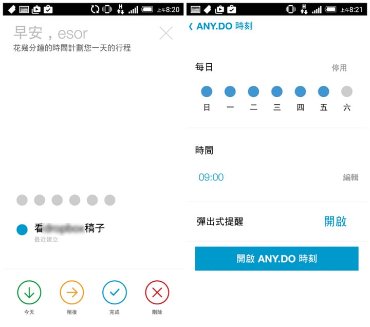 Any.Do 一直以来有一个我非常欣赏的独特设计,有用过 Any.Do 的朋友应该也都能感受到它的价值,那就是「Any.Do 时刻」,这个功能可以让我自由设定成每周一到五工作日的早上出门八点时弹出。