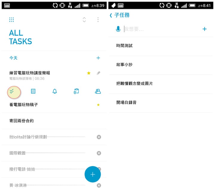 例如我写下一个「准备电脑玩物讲座简报」的任务,但这个任务很大,这个任务很空泛,只是一个想要达成的目标的形容,于是我应该在 Any.Do 中继续展开「子任务」清单的功能,把完成这个目标应该要做到的具体步骤写下来,例如:练习开场白、测试时间、穿插的故事小抄等等。