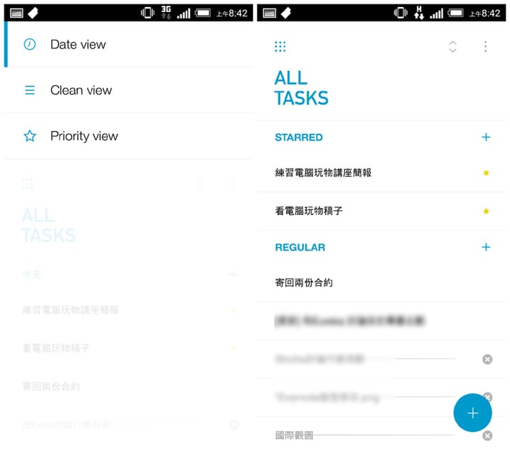 而在 Any.Do 3.0 中让用户可以选择三种浏览待办清单的视野:时间排序、完全排序、重要性排序,在重要性排序中会把所有任务分成「打上星号」与「没有打上星号」,并且把星号任务排序在最上方。