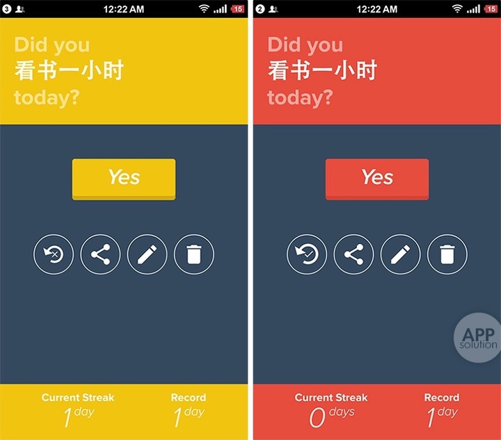 作为一款「习惯追踪器」,简而不陋可以很恰当地形容它。当任务中断了一天或超时完成,Pledge 会给你亮起黄灯。如果没坚持下来中断了,等着你的就是红牌警告。但这就是这款应用唯一的提醒方式了:坚持与否,不在于有没有朋友互相监督,或者卖萌打滚地鼓励你,也不必每次打卡后都要写点什么,全凭个人毅力。