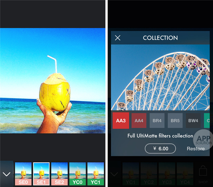 值得一说的是它的滤镜。在数量上,多达 29 种不同的滤镜,总能让你找到满意的效果;质量上,UltiMatte 的滤镜像极了 VSCOcam 的风格,色彩鲜亮活泼,能够使照片模拟出不同胶片拍出来的效果。另外,它的内购可解锁另外 10 种滤镜,性价比很高。