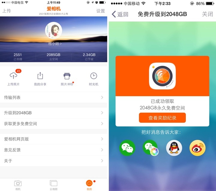 具体操作层面,在「我的」标签里找到「升级到 2048 GB」按钮,之后根据指引将这个好消息分享到微信、微博、QQ 任一平台的好友,即可成功领取 2TB 免费空间。