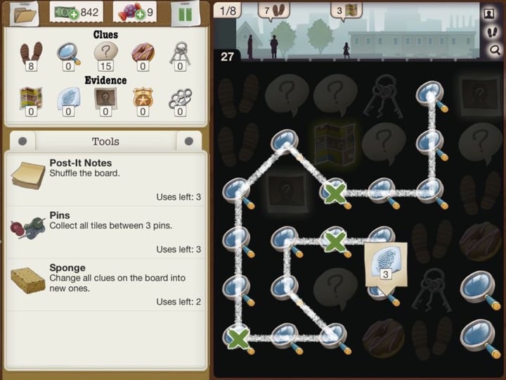 由于本作加入了消除玩法,所以让它在千篇一律都是寻物玩法的悬疑解谜游戏中显得独树一帜。在收集证物的环节,玩家要通过连线消除的形式获得物品。而在指证阶段,玩家可以从收集的物品中找到提示道具,然后结合嫌疑人的特点与下方的问题进行推理,指出谁是犯人。