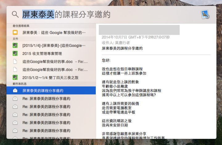 而且利用 Mac 的 Spotlight 还能在搜索中直接就预览文件内容,有时候根本不用真的打开文件就已经看到我要看的资料。