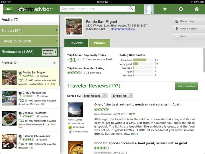 餐馆点评大全 Yelp 以及餐馆和经典推荐应用 TripAdvisor 应该是你必下的应用了,原因跟你手机上一定会装一个大众点评类似,因为他们信息最大最全,而且上面有真实陌生的吃客点评。