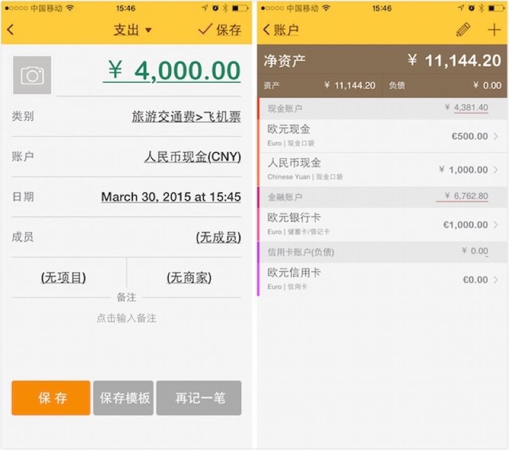 其次就是要添加现金、金融、信用卡等等账户,例如你带了 500 欧元,就可以建立一个 500 欧元的现金账户,日常用度就从这个账户里面扣除。