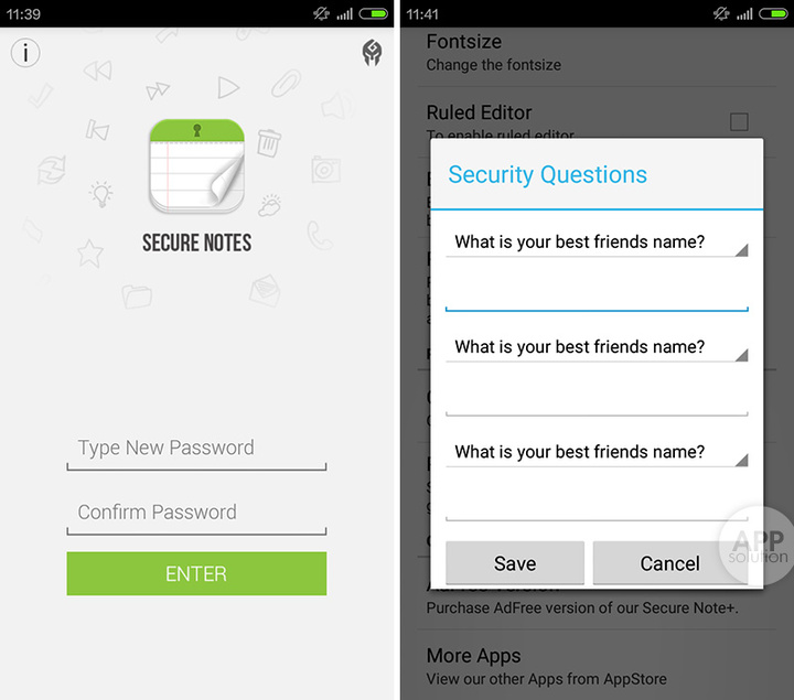 从名字就能看出这款 app 的亮点所在,Secure Notes 通过 AES 加密算法来保护你的笔记信息安全。初次启动时,Secure Notes 会要求你输入主密码。密码越复杂,安全性也就越高。担心忘记密码?那就设置密保问题吧。
