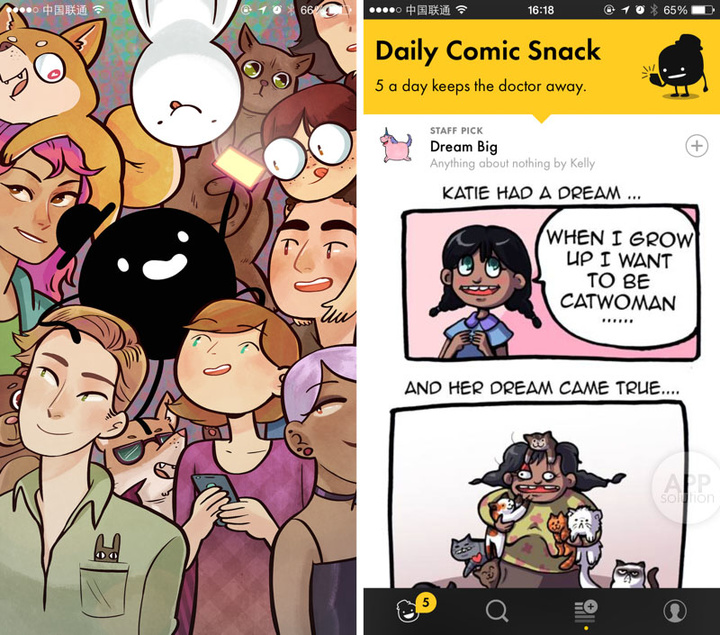 初次打开 Tapastic,一副有黑白到彩色的画面展现在面前,很有年代感,独爱中间那个叫做 Mascot 的小煤球。一日三餐,搭配五篇精选漫画,让你在二次元中「远离医生,保持健康」。