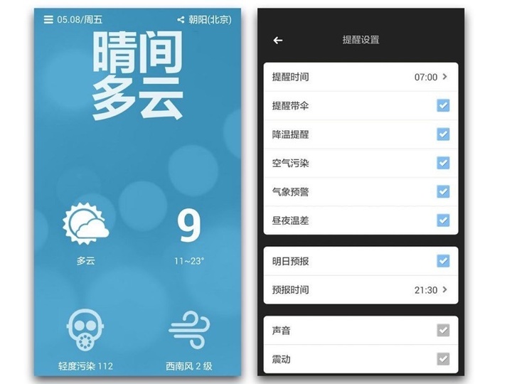 是时候也替爸爸妈妈操操心了,懒人天气可以预测 6 日内的天气, 并设置天气变化设置提醒。比如气温比昨天降超过5度,妈妈的手机上就会出现温度骤降提醒。而且它的字体够大,不用担心妈妈看不清。