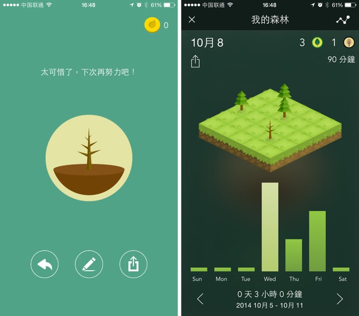 当你开始加班,用 Forest 种一棵树,只有在不退出应用的情况下,树才能成活。当树籽种下之后,除了锁屏之外任何退出 app 界面的动作都会导致树籽枯死。在加班前,种下一个个树籽,加班结束后,看着一颗颗茁壮的大树,这种成就感,多少能够冲淡加班带来的疲劳感吧。