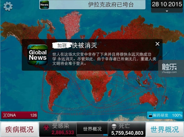 当最后,你所操控的「加班」病毒毁灭了全人类。也许能让你稍微感到轻松一些。