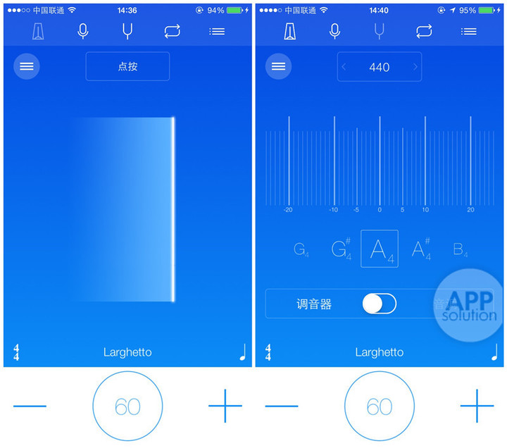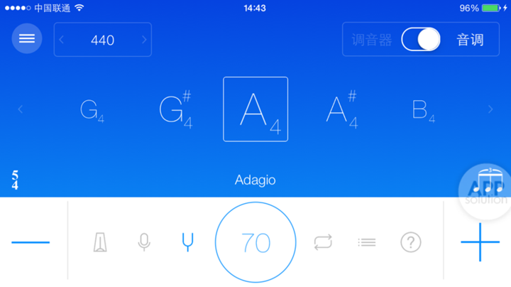 Practice+ 界面设计简单明了,易于上手。其中集成了 5 个功能:「节拍器」,采用半屏反馈节拍的显示方式,竖条左右扫动,易于演奏者视觉上跟上拍子练习;「调音器」,采用频率显示方式提示调音准确度。Practice+ 适用于所有乐器的练习,所以对于吉他的自动听音并没有进行设计,需演奏者自行选取音调。