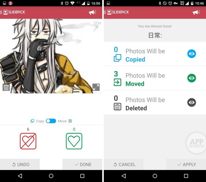 中间按钮的小开关会询问你是否将照片留在原文件夹,如果你的手机存储比较吃紧,建议选择「Move」。整理完毕以后,SlidePick 会告诉你整理结果。