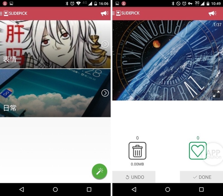 整理完毕之后,就可以在主界面看到新的相册啦,SlidePick 还自带「清理」功能。在侧边栏找到它,与添加照片类似,依然是进行选择,只不过 Dislike 按钮变成了删除按钮。