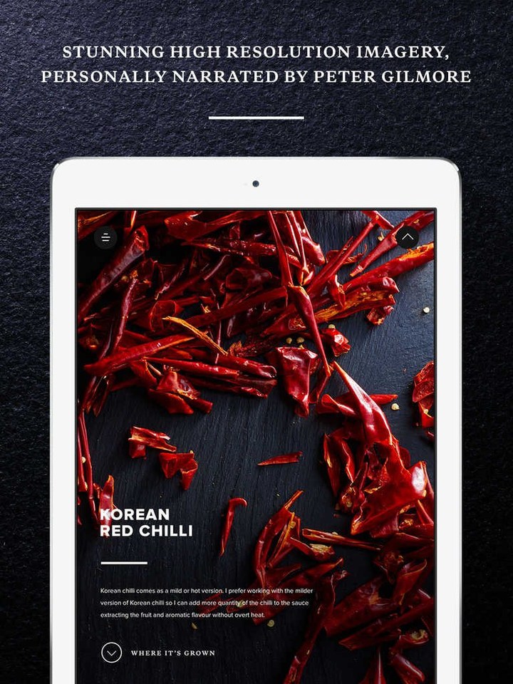 来自全球最佳餐厅大厨 Peter Glimore 的推荐菜谱,你可以在 iPad 上与食物进行奇妙的互动,Peter 也会「亲自」指导你完成他所创造的非凡菜肴。即使不做菜,app 中那些令人惊叹的照片和影像,也值得好好欣赏。