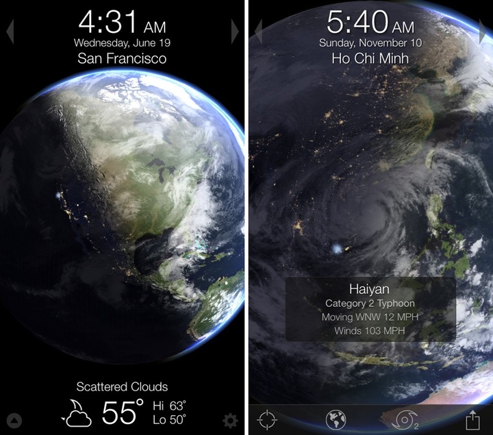 一款带有绚丽 3D 实时模拟地球的天气 app,并配有全球个城市的世界时钟。当你转动地球,还能实时追踪探索全球的云纹、飓风和热带风暴,非常壮观。