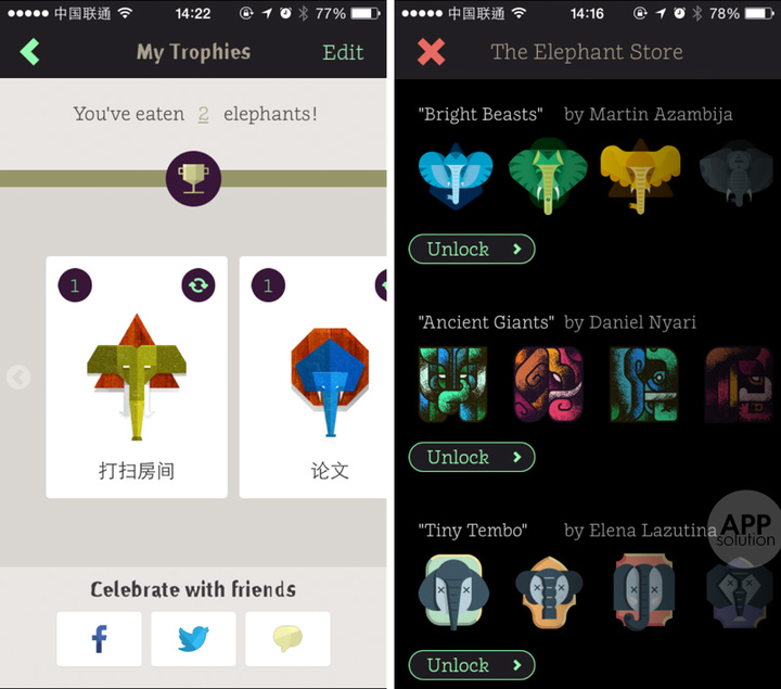ElephantBites 其实是一个包裹着「壁画风格」的 todo 类 app,第一次打开时候,会以一个吃掉大象的故事向你讲述「怎样合理完成项目」,十分有趣。