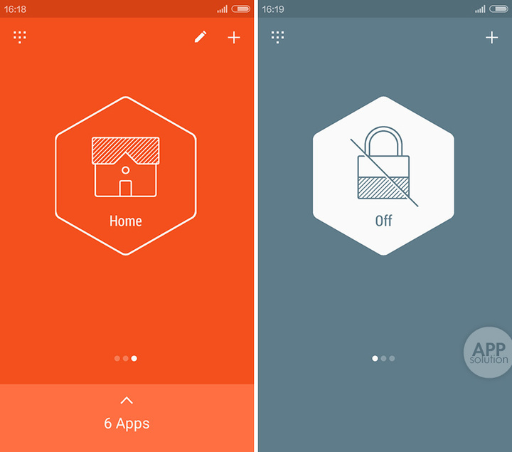 Hexlock 为你预置了 Home、Work、Off 三种情景,通过左右滑动,便可在场景之间来回切换。轻触场景图标,即可启动该场景。当然,你也可以自行编辑和添加更多场景。