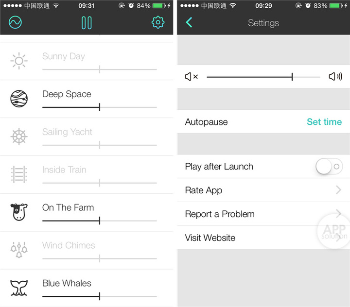 Noizio 内含十五种天籁之音,除了很常见的风声、雨声、人语声等自然之声外,Noizio 还收录一些特殊场景的声音,如农场上奶牛的嚎叫、海洋深处蓝鲸的低吼和太空寂寥的回声。在「设置」中,可以设定自动停止播放的时间。