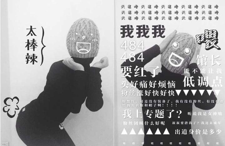 @Fancy 妹妹,形象是一名生活中的逗比女青年,「成名作」是将一系列「德田有希」的插画仿真,完美复现原作者既荒谬又脑洞大开的人物形象。