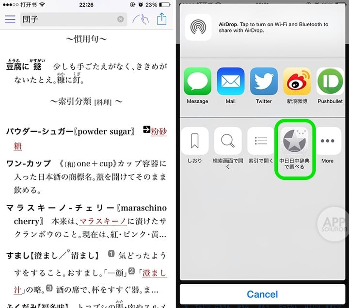 另外,「大辞泉」还支持跨词典跳查。可以一键跳转到「中日•日中辞典」查看中文释义,是不是很方便呢?