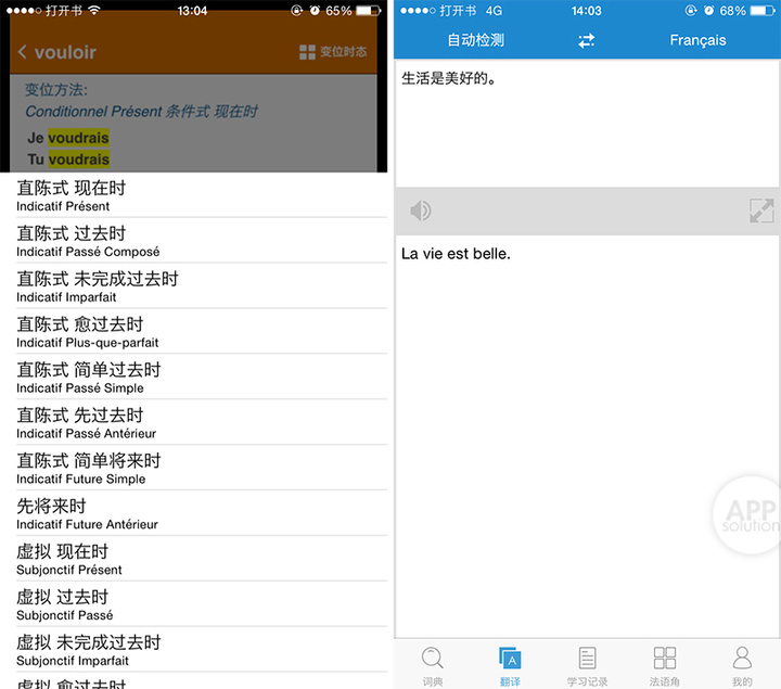 - 动词变位菜单/形容词配合:本功能的重要性不必多言。更厉害的是,在摄像头取词翻译中「助手」能识别变位并显示原型。好个「照妖镜」。